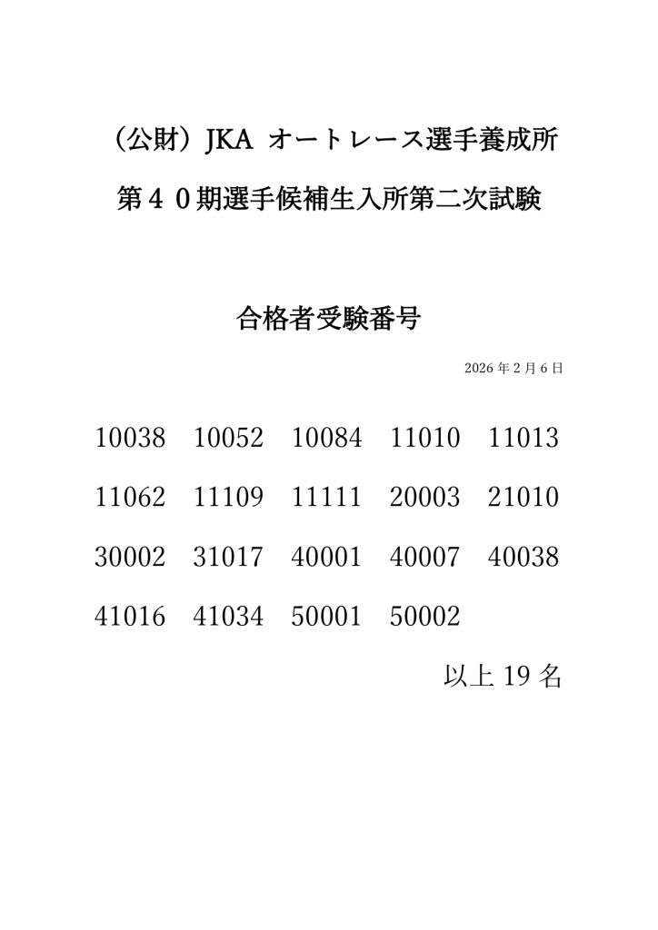 オートレース選手養成所第40期選手候補生入所試験 合格者について 2026.02.06 標記について、オートレース選手養成所は第40期選手候補生入所試験を行い、合格者(19名)を決定しましたので、以下の通りお知らせいたします。 トピックス一覧へ戻る